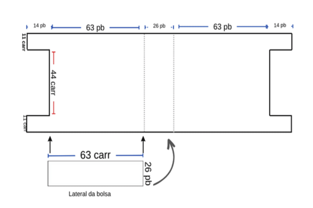 Na cor 004 (cru) iniciar com 26 corr + 1 corr e trabalhar por 63 carr de 26 pb. - Montagem da bolsa: