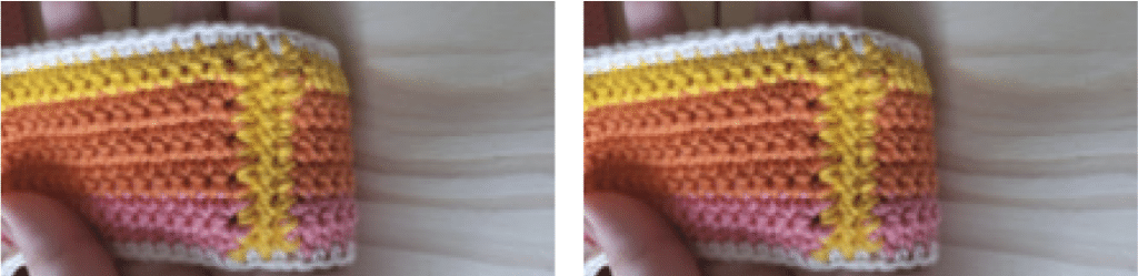 Corte o fio e troque para a cor 2234 (jerimum) e teça 180 pb por 6 carr.
