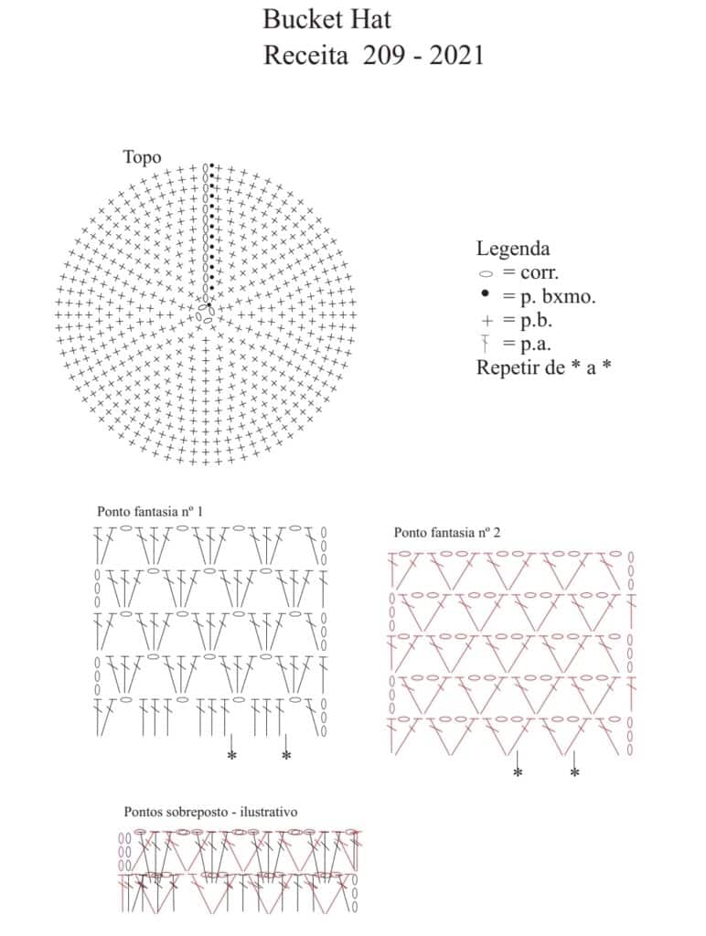 Correntinha (corr.). Pont baixíssimo (p. bxmo.): Introduza a ag., laç., puxe o p. e passe diretamente no p. da ag.. Pnto baixo (p. b.): introduza a ag. laç., puxe o p. e com outra laç., rem. todos os p.. Pto alto (p. a.): laç., introduza a ag., laç., puxe o p. laç., rem., 2 p. e com outra laç., rem. todos os p.. Topo: siga o gráfico. Ponto fantasia 1 e 2: siga o gráfico correspondente. Ponto ilustrativo: Ver gráfico – como trabalhar os gráficos 1 e 2.