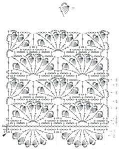 Pontos utilizados: Correntinha (corr.). Ponto baixo (p. b.): introduza a ag. laç., puxe o p. e com outra laç., rem. todos os p.. Meio ponto (m. p.): laç., introduza a ag., laç., puxe o p. laç., rem. todos os p.. Ponto alto (p. a.): laç., introduza a ag., laç., puxe o p. laç., rem., 2 p. e com outra laç., rem. todos os p.. Ponto fantasia: siga o gráfico.