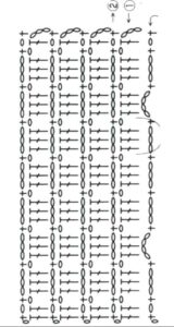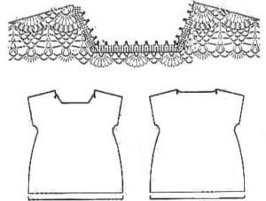 A 60 cm do início do trabalho faça a outra cava como a primeira. A 80 cm do início do trabalho rem.. Laterais do transpasse – Prenda o fio duplo no início do trabalho (p. em vermelho no molde) e trabalhe 17 p. em p. b. (= 24 cm). Deixe de fazer de cada lado em cada carr.: 1 p. (7 v.), sobram 3 p., continue em p. b. durante 34 cm e rem.. Faça o outro lado igual. Costure os ombros. Com o fio tâmara trabalhe em círculo a toda volta das cavas 5 carr. em p. fantasia seguindo o gráfico e rem..