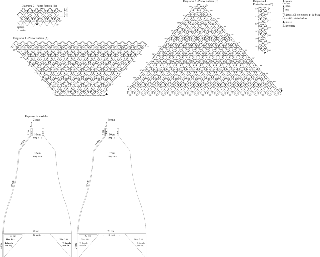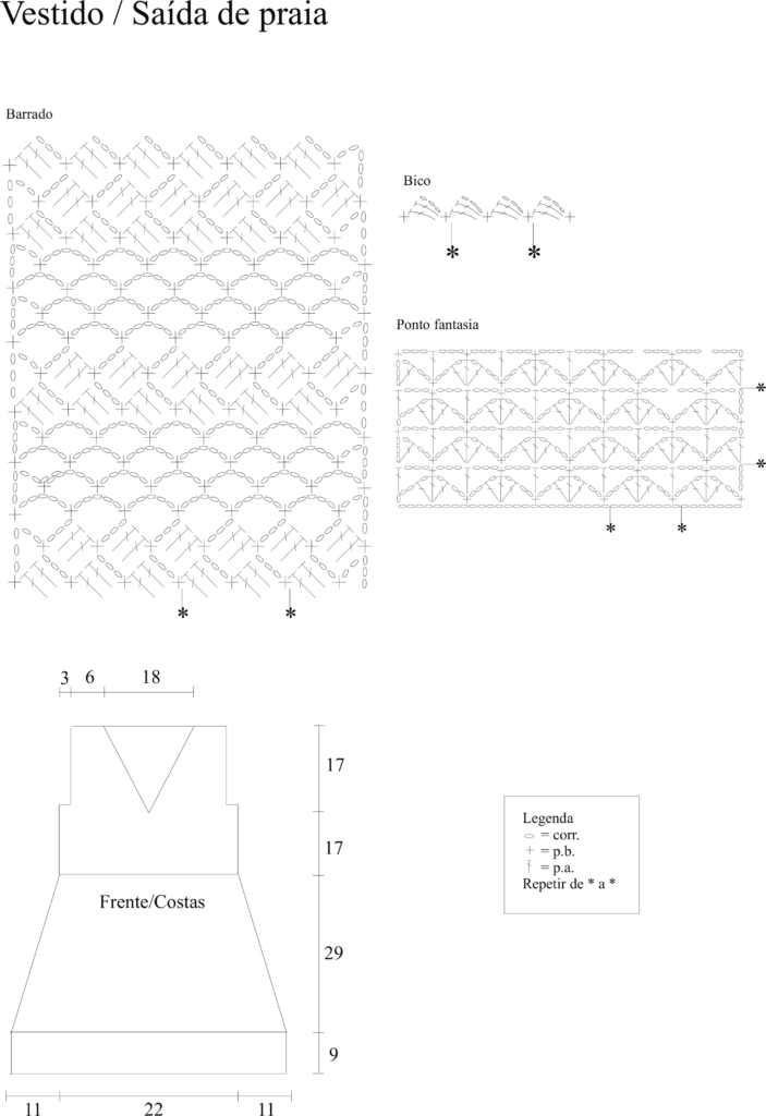 Costas – Faça uma corr. de 80 p. mais 3 corr. para virar e trabalhe em p. fantasia seguindo o gráfico, repita de * a * (10 v.). A17 cm do início do trabalho, rem.. Frente – Use a mesma corr. de base e trabalhe nas duas laterais para os ombros cada lado separadamente 2 motivos (de * a *). A 6 cm do início do trabalho aum. do lado do decote em cada carr.: 2 p. (15 v.). A 17 cm do início do trabalho estando os dois lados da frente com o mesmo nº de carr., faça uma carr. unindo as duas partes da frente entre si. Para as cavas faça entre a frente e as costas de cada lado uma corr. de 8 p. e continue trabalhando em p. fantasia e em círculo, faça 1 motivo nas corr. de cada lado. A 34 cm do início do trabalho distribua 7 motivos (de * a *) de aum. durante uma carr.. A 52 cm do início do trabalho distribua mais 8 motivos de aum. durante uma carr.. A 63 cm do início do trabalhe o barrado seguindo o gráfico. A 72 cm do início do trabalho, rem..