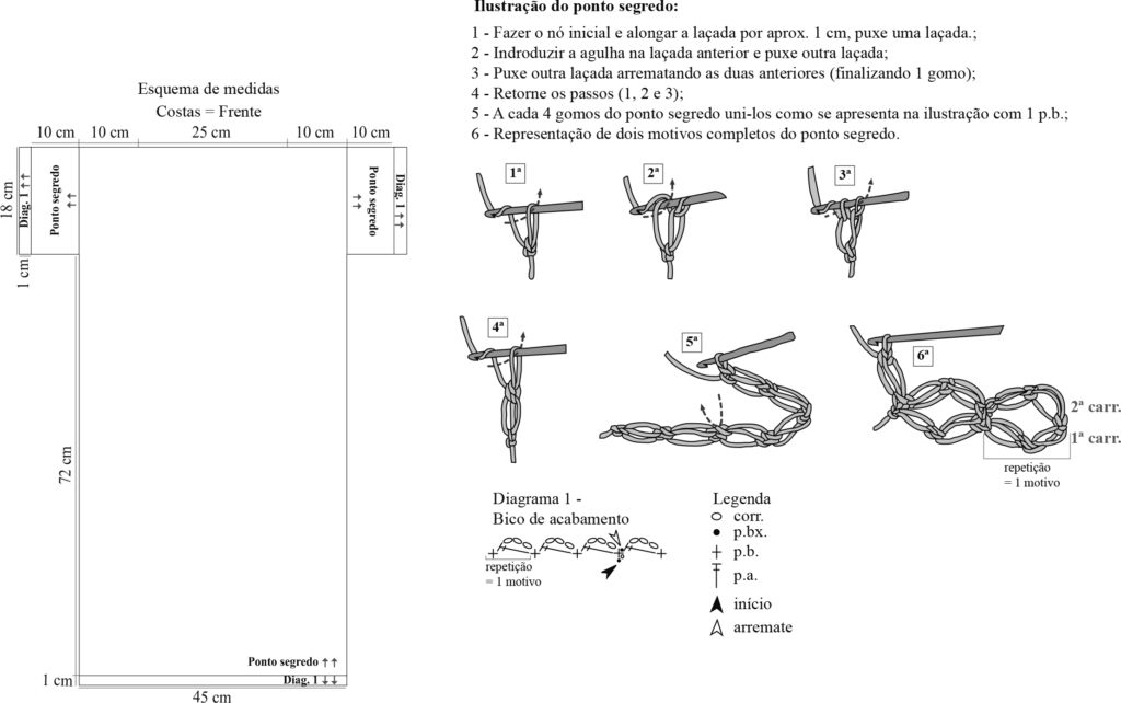 Pontos utilizados no crochê: corr.: correntinha, p.bx.: ponto baixíssimo, p.b.: ponto baixo, p.a.: ponto alto, p. segredo: siga a ilustração, bico de acabamento: siga o diag. 1.