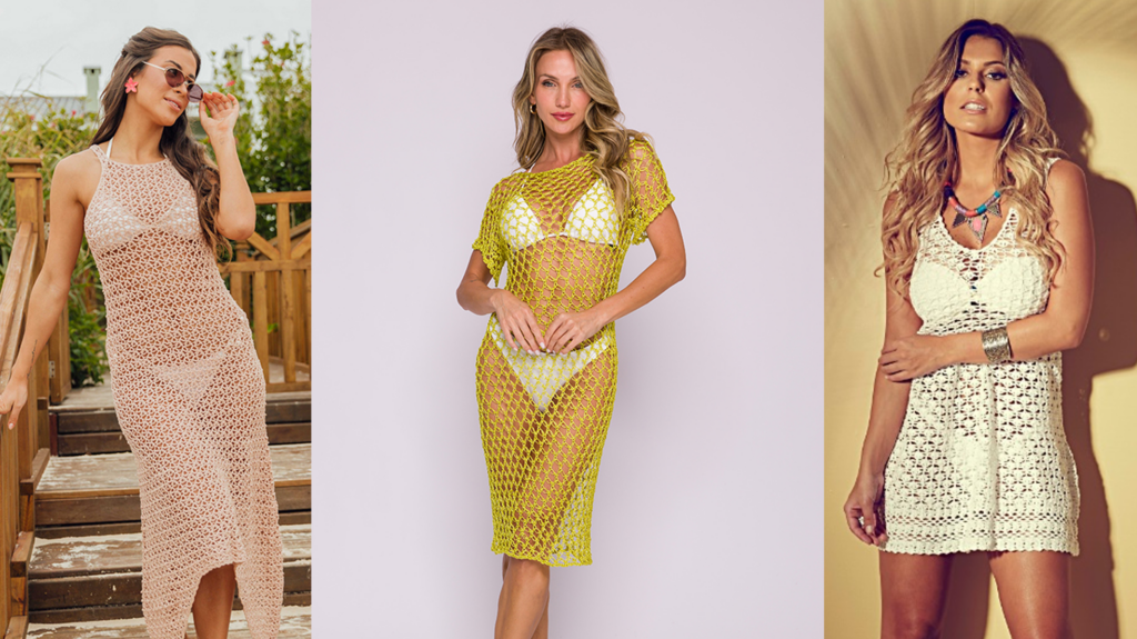 Para quem prefere algo mais despojado e com um toque sensual, a saída de praia curta com transparência é um sucesso de vendas. Por ser mais curta, ela oferece liberdade de movimento e é ideal para aquelas que gostam de mostrar mais o corpo de forma sutil e charmosa. Normalmente feita com pontos mais abertos, essa peça valoriza o biquíni e é perfeita para quem quer uma saída prática e estilosa para o dia a dia na praia ou na piscina.