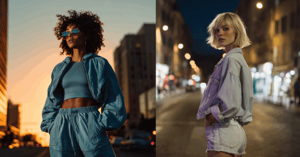 - Y2K Revival – Elementos dos anos 2000, como tops curtos, cinturas baixas e acessórios coloridos.