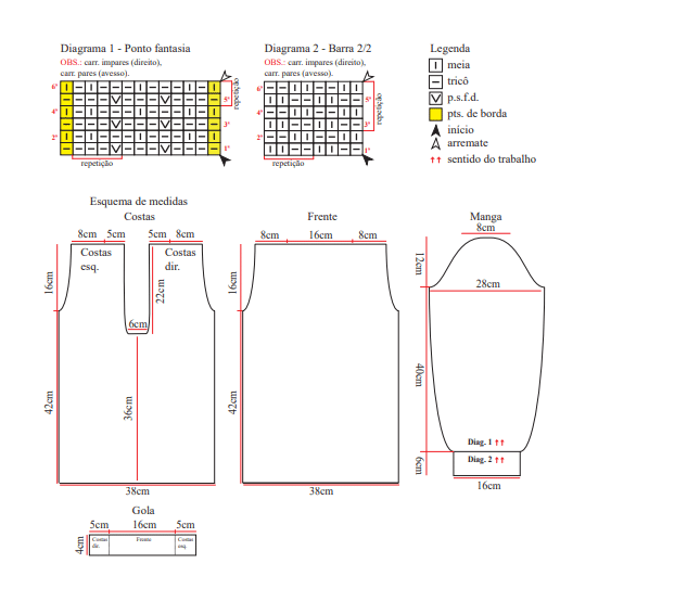 Execução: Transfira os moldes para o papel vegetal para usar como referência na execução da peça. Observe as setas no esquema de medidas com a indicação do sentido do trabalho. Costas: Use o fio Precioso na cor dourado monte 86 pts. na ag. de tricô de 6,0mm, inicie pela barra tric. no p. fantasia acomp. o diag. 1 e os pts. de rep.. À 36cm de comp. do início rem. os 14 pts. centrais e tric. sobre os 36 pts. de cada lado separadamente.