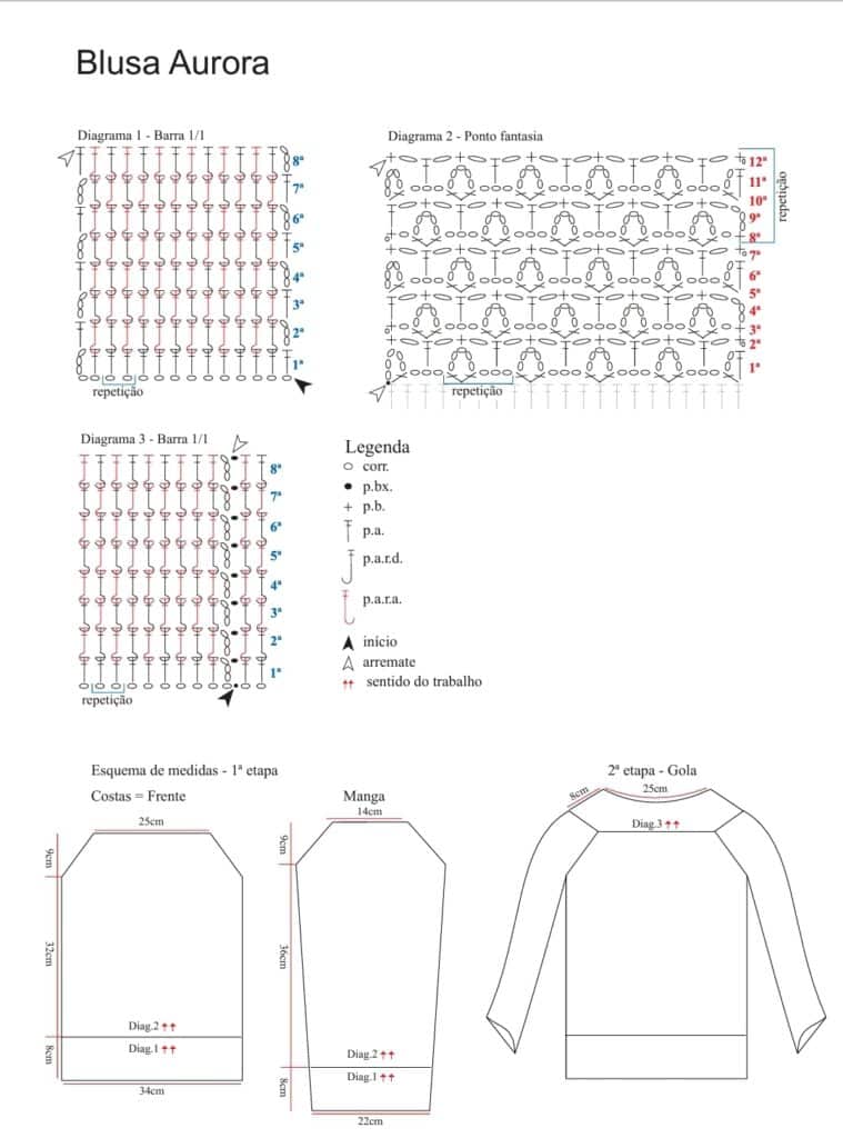 Abreviaturas: P: ponto, pts.: pontos, nov.: novelo, carr.: carreira, ag.: agulha, , trab.: trabalhe ou trabalhando, diag.: diagrama, rep.: repetição.