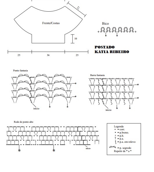 Frente e costas – São trabalhadas juntas. Faça uma corr. de 168 p. feche em círculo e trabalhe em rede de p.a. seguindo o gráfico, repita de * a * (8 v.). Terminado o gráfico da rede de p.a. trabalhe em p. fantasia seguindo o gráfico, repita de * a * (46 v.). A 27 cm do início, divida o trabalho seguinte modo: 14 vezes de * a * do, p. fantasia para a frente, 9 vezes de * a * do, p. fantasia para uma manga, 14 vezes de * a * do, p. fantasia para as costas e 9 vezes de * a * do, p. fantasia para outra manga. Trabalhe nos p. da frente e das costas em círculo e barra fantasia seguindo o gráfico, repita de * a * (28 v.). A 10 cm da barra fantasia rem.. Faça a toda volta do decote o bico seguindo o gráfico.
