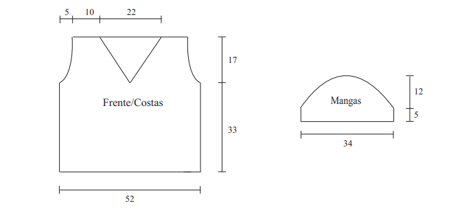 Mangas: Inicie com uma correntinha de 100 pontos, fechando em círculo, e trabalhe em ponto fantasia. Após 5 cm, trabalhe carreiras de ida e volta, diminuindo para a cava 1 ponto de cada lado em cada carreira por 6 vezes, e depois 2 pontos por 12 vezes, então arremate.