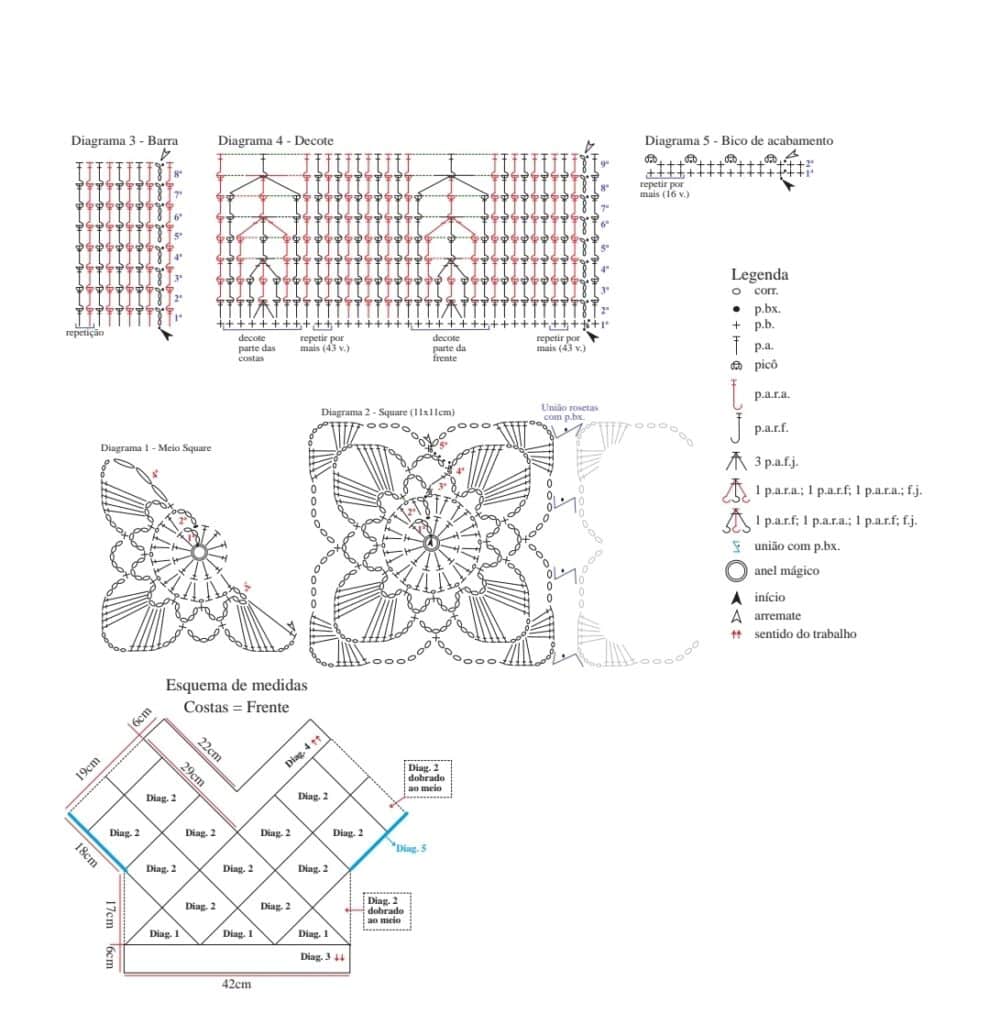 Logo depois, para compor frente e costas serão necessários: 6 mot. (diag. 1), 28 mot. (diag. 2), então, unidos entre si com p.bx. como se apresenta no esquema de medidas deixando a abertura das cavas de (18cm).