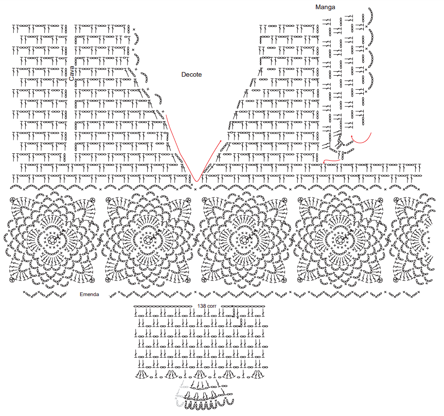A parte inferior da blusa é feita separadamente, iniciando com 138 correntinhas fechadas em anel. A partir desse ponto, segue-se um padrão de duas correntinhas, pula duas, e um ponto alto nas duas correntinhas subsequentes. Finalmente, a parte inferior é emendada à parte superior usando uma carreira de ponto baixo e correntinhas, completando a blusa.