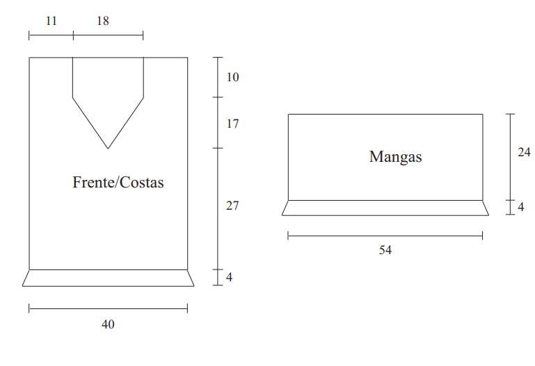 Mangas – Monte 82 p. nas ag. nº 7,0mm e tric. do seguinte modo para fazer o babado da borda inferior: 4 carr. em p. meia, 1 carr. pegando 2 p. juntos em toda a carr. (ficam 41 p. na ag.), 4 carr. em p. tricô, 1 carr. aum. (tric. 2 p. em cada p.) 41 p. na carr. (ficam 82 p. na ag.). Em seguida tric. em p. fantasia. A 28 cm do início do trabalho rem..