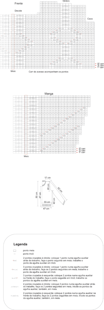 Pontos usados: meia (m); tricô (t); pontos cruzados à direita e à esquerda. Execução – Frente: Monte 57 pontos nas agulhas 8 mm e trabalhe 9 carreiras em barra 1X1 (1 m, 1 t). Passe para as agulhas 8 mm e trabalhe: 1ª e 3ª carr (avesso): 4 t, 2 m, 8 t, 2 m, 8 t, 4 m, 1 t, 4 m, 8 t, 2 m, 8 t, 2 m, 4 t. 2ª e todas as carr pares: trabalhe os pontos como se apresentam (onde aparece t, faça t; onde aparece m, trabalhe m). 5ª carr: 4 t, 3 pontos cruzados à esquerda (= coloque 2 pontos numa agulha auxiliar na frente do trabalho, tricote o ponto seguinte em t; faça os pontos da agulha auxiliar em m); 6 t, 3 pontos cruzados à direita (= coloque 1 ponto numa agulha auxiliar atrás do trabalho, tricote os 2 pontos seguintes em m; faça o ponto da agulha auxiliar em t); 8 t, 4 pontos cruzados à direita (= coloque 2 pontos numa agulha auxiliar atrás do trabalho, tricote os 2 pontos seguintes em m; faça os pontos da agulha auxiliar em m); 1 t, 4 pontos cruzados à esquerda, 8 t, 3 pontos cruzados esquerda, 6 t, 3 pontos cruzados à direita, 4 t. 7ª carr: 5 t, 3 pontos cruzados à esquerda, 4 t, 3 pontos cruzados à direita, 9 t, 4 m, 1 t, 4 m, 9 t, 3 pontos cruzados esquerda, 4 t, 3 pontos cruzados à direita, 5 t. Continue acompanhando o gráfico da Frente até alcançar 40 cm desde o início e forme as cavas diminuindo 3 pontos de cada lado (1 vez). Decote: Aos 47 cm desde o início arremate os 17 pontos centrais e trabalhe os lados separadamente diminuindo 1 ponto de cada lado (1 vez). Trabalhe mais 8 carr e arremate para o ombro 5 pontos (2 vezes); 6 pontos (1 vez). Costas: Trabalhe até no decote como a Frente. Faça o decote a 50 cm do início e arremate os 18 pontos centrais; arremate os pontos dos ombros em 3 vezes. Mangas: Monte 34 pontos nas agulhas 8 mm e trabalhe 13 carr em barra 1X1. Passe para as agulhas 9 mm e acompanhe o gráfico Manga. Aumente 1 ponto de cada lado a cada 6 carr (5 vezes). A 52 cm do início arremate todos os pontos de uma só vez; Feche 1 ombro e usando agulhas 8 mm, levante 52 pontos ao redor do decote, tricote 5 carr em barra 1X1 e arremate. Feche o 2º ombro, pregue as mangas e feche lados e mangas. Artesã – Marli Schreiber (205849)