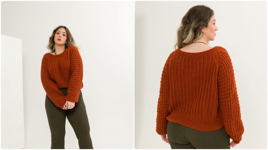 O processo de tricotar a blusa Toscana inicia-se com a preparação das costas e da frente, ambas trabalhadas de forma semelhante para padronizar o acabamento. Segue-se um procedimento que envolve a montagem dos pontos na agulha, a criação da barra 1×1 e a transição para o ponto fantasia, conferindo textura à peça. Uma parte fundamental do trabalho envolve os aumentos, diminuições e a execução das cavas raglã, que garantem o bom caimento da blusa.