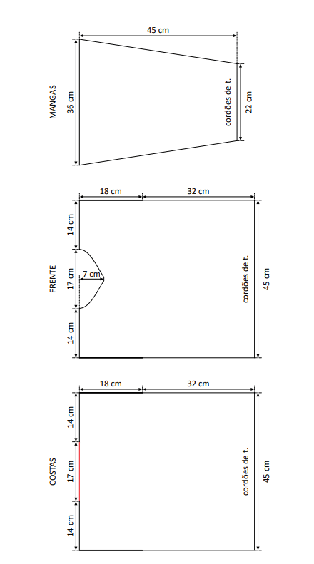Costure as laterais a partir da barra deixando 18 cm abertos para as cavas e os ombros, frente e costas.