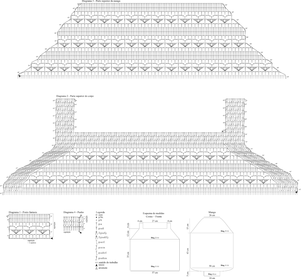 Pontos utilizados no crochê: corr.: correntinha, p.bx.: ponto baixíssimo, p.b.: ponto baixo, p.a.: ponto alto, p.a.d.: ponto alto duplo, 2 p.a.f.j.: 2 pts. altos fechados juntos em pts. de bases diferentes, 2 p.a.d.f.j.: 2 pts. altos duplos fechados juntos em pts. de bases diferentes, p.a.r.f.: p. alto em relevo pegando pela frente do p. da carr. anterior, p.a.r.a.: p. alto em relevo pegando por trás do p. da carr. anterior, p.a.d.r.f.: p. alto duplo em relevo pegando pela frente do p. da carr. anterior, p.a.d.r.a.: p. alto duplo em relevo pegando por trás do p. da carr. anterior, p. fantasia: siga o diag. 1, parte superior do corpo: siga o diag. 2, parte superior da manga: siga os diag. 3, punho: siga o diag. 4.