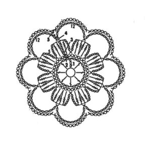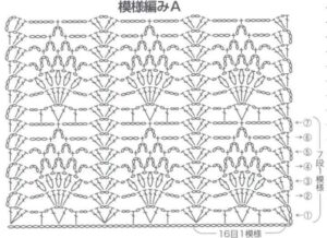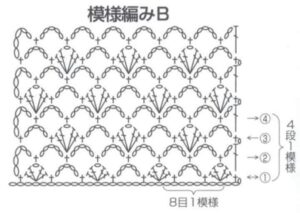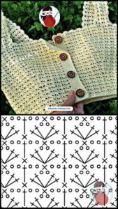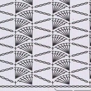 Amostra: um quadrado de 10 cm no p. fantasia (B – diag. 2) na ag. de crochê de 2,0 mm = 24 pts. x 12 carr.
