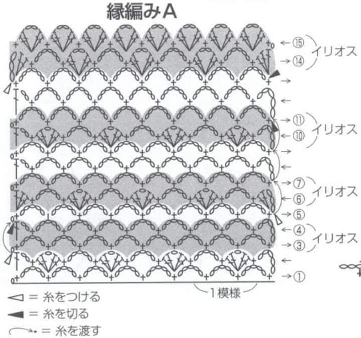 Abreviaturas: acomp.: acompanhando, ag.: agulha, carr.: carreira, diag.: diagrama, p.: ponto, pts.: pontos, nov.: novelo, rep.: repetição ou repetições, seg.: seguinte, rem.: rematar, trab.: trabalhe, v.: vezes.