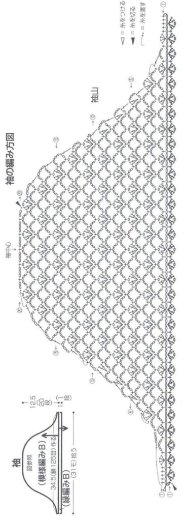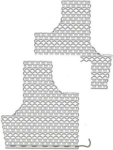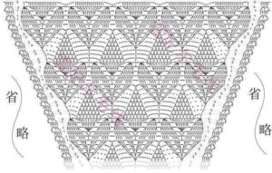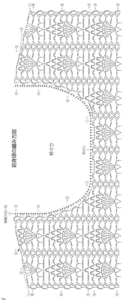 Gola: use a ag. de crochê de 2,0 mm e o fio Cléa Duplo (3106). Una o fio no decote e trab. a gola no p. fantasia (D) acomp. o diag. 4 e o p. de rep. da 65ª até a 68ª carr., rem. o fio.