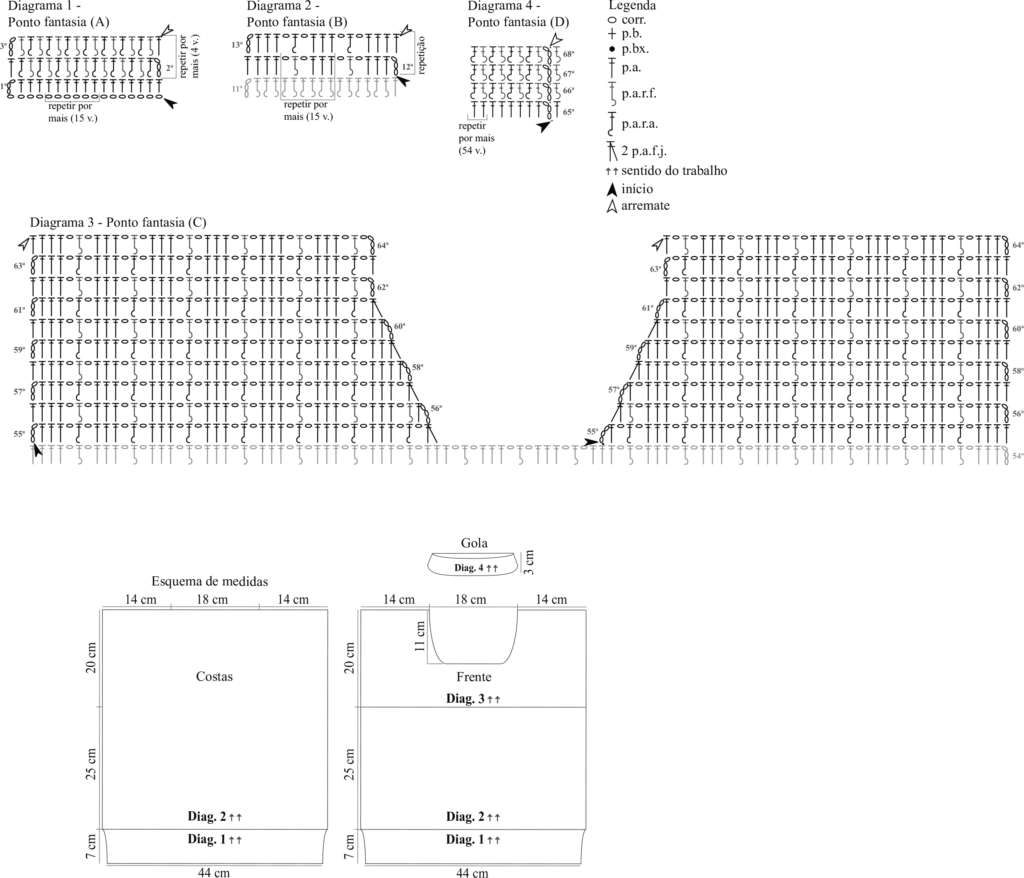 Pontos utilizados no crochê: corr.: correntinha, p.b.: ponto baixo, p.bx.: ponto baixíssimo, p.a.: ponto alto, p.a.r.f.: p. alto em relevo pegando pela frente do p. da carr. anterior, p.a.r.a.: p. alto em relevo pegando por trás do p. da carr. anterior, 2 p.a.f.j.: 2 pts. altos fechados juntos pegos em pts. de bases diferentes, p. fantasia (A): siga o diag. 1, p. fantasia (B): siga o diag. 2, p. fantasia (C): siga o diag. 3, p. fantasia (D): siga o diag. 4.