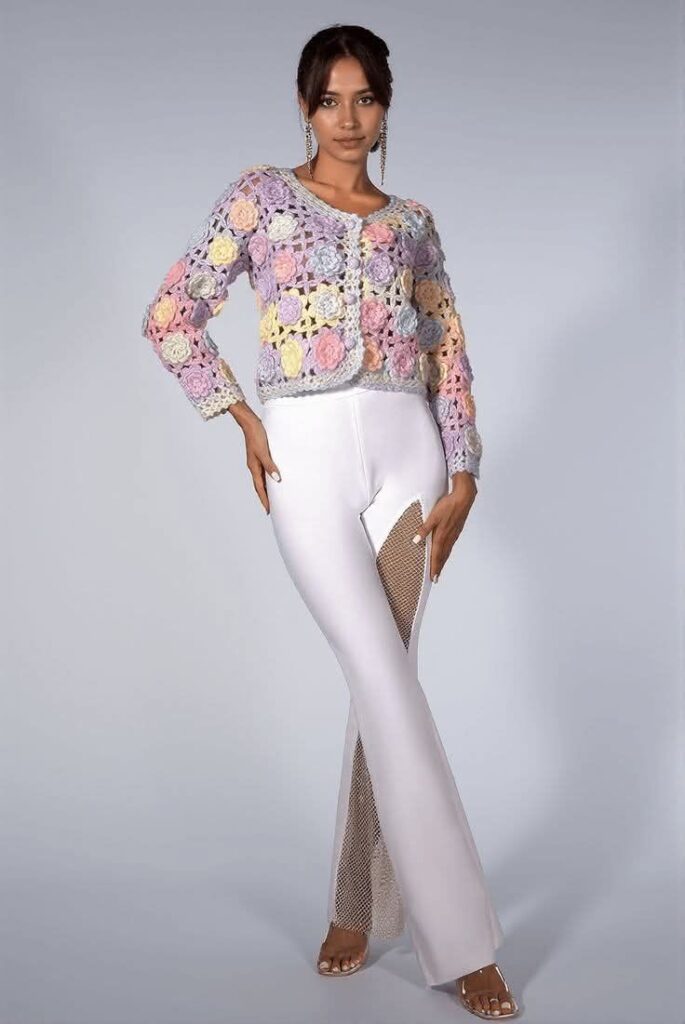Blusas e cardigãs feitos com squares florais são ideais para quem busca unir o melhor do crochê tradicional com o frescor das tendências atuais.