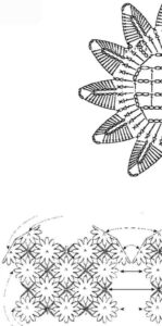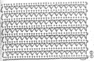 Frente e costas: São trabalhadas juntas. Faça uma corr. de 224 p. feche em círculo e trabalhe em p. fantasia nº 1 seguindo o gráfico, repita de * a * no sentido dos p. (14 v.). A 30 cm do início do trabalho, para a abertura lateral trabalhe em carr. de ida e volta. A 38 cm do início divida o trabalho em duas partes iguais e trabalhe cada lado separadamente. Trabalhe em p. fantasia nº 2 seguindo o gráfico. Deixe do lado da abertura 5 cm sem trabalhar (veja molde).