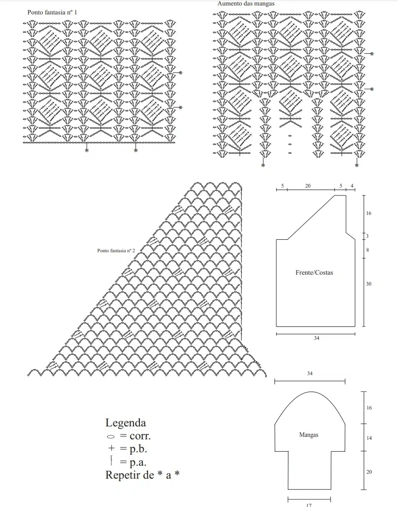 Tamanho: 38/40 Pontos utilizados: Correntinha (corr.). Ponto baixo (p. b.): introduza a ag. laç., puxe o p. e com outra laç., rem. todos os p.. Pnto alto (p. a.): laç., introduza a ag., laç., puxe o p. laç., rem., 2 p. e com outra laç., rem. todos os p.. Pto caranguejo: trabalhe em p. b. da esquerda para direita. Ponto fantasia 1 e 2: siga o gráfico correspondente. Aumentos da manga: siga o gráfico