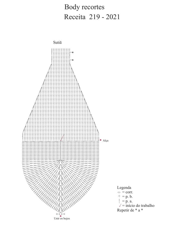 Sutiã – Primeiramente, comece pelo bojo. Assim, faça uma corr. de 14 p. mais 3 corr. para virar e trabalhe seguindo o gráfico. Então, terminado o gráfico, trabalhe de * a * durante 24 cm e rem.. Faça duas partes iguais. Assim, com as duas partes prontas, para unir as duas partes, faça 3 carr. em p. b. no ponto indicado no gráfico.