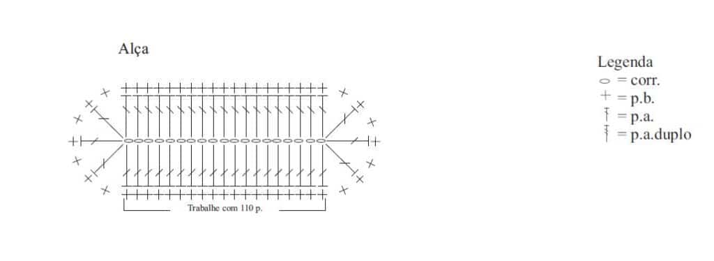 Faça um cordão com 110 correntes e a partir daqui siga o gráfico. Faça duas alças iguais. Como reforço da alças, forre o lado interno de cada uma com tecido e costure com pontos à mão e linha normal para costura. Depois que a bolsa já estiver com o forro costurado, fixe as alças na bolsa utilizando rebites de metal.