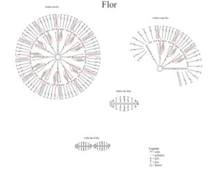 Seguindo os gráficos faça: 3 flores grandes, 5 meias flores e 5 pares de folhas. Acomode os motivos na bolsa conforme mostra a Figura 1 e fixe-os utilizando cola quente.