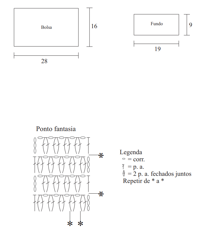 - Fundo: Inicie com uma correntinha de 36 pontos, acrescente 1 correntinha para virar. Trabalhe em ponto baixo até atingir 9 cm de comprimento.