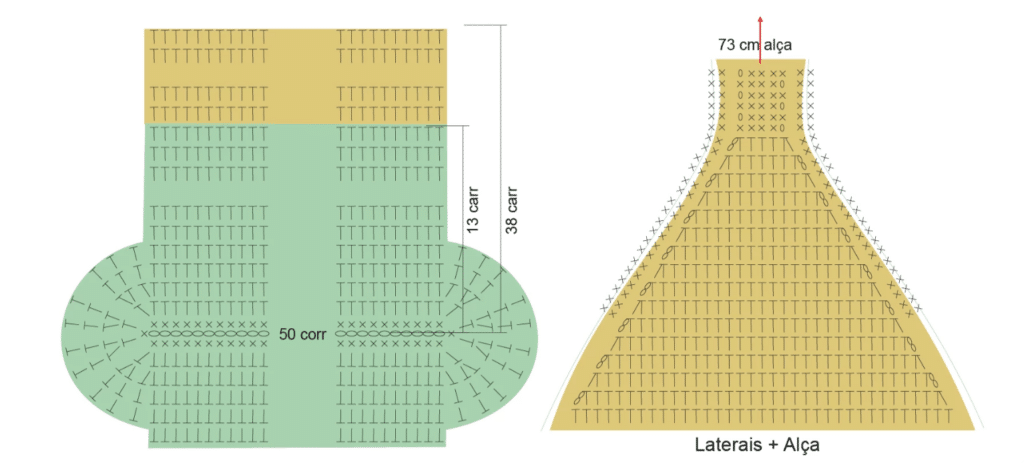 Trabalhe igual na outra lateral e, quando chegar a 5 pontos, trabalhe em p.b. por 73 cm para formar a alça e uni-la ao outro lado.Passe 1 carr de p.b. bege em toda a abertura da bolsa e, em seguida, 1 carr de p.b. com o verde musgo. Observe o gráfico.