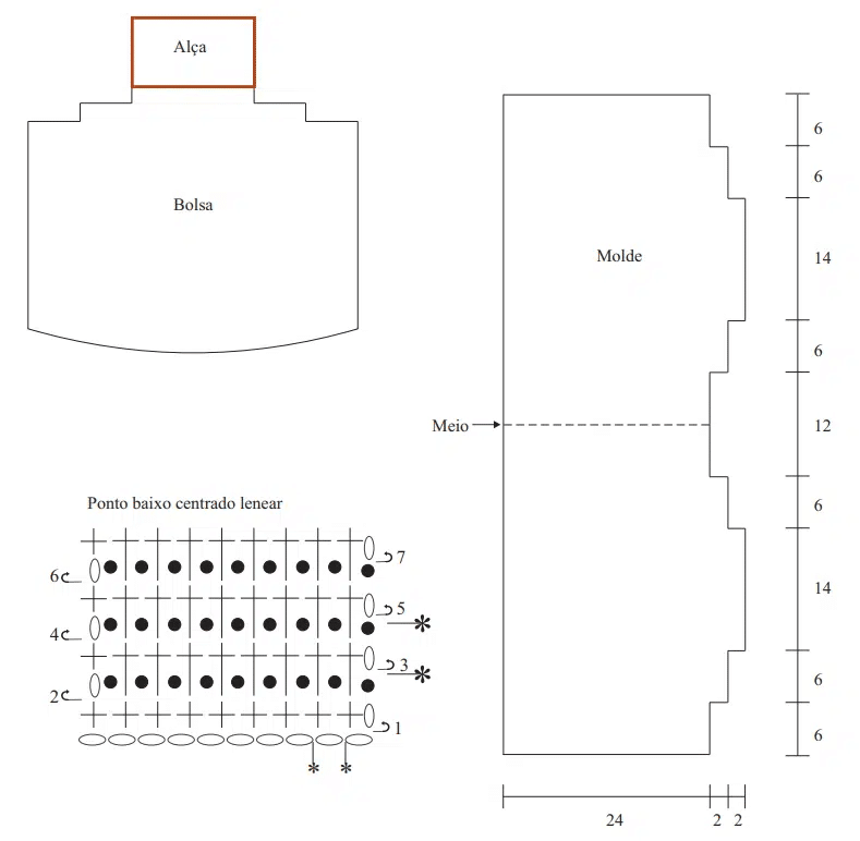 Bolsa – A bolsa é trabalhada na horizontal. Laterais – Com a ag. nº 7,0mm faça uma corr. de 12 p. mais 1 corr. para virar e trabalhe em p. b. centrado linear seguindo o gráfico. A 6 cm do início do trabalho aum. à direita 1 p.. A 12 cm do início do trabalho aum. à direita mais 1 p. (ficam 14 p. em toda a carr.). A 26 cm do início do trabalho dim. à direita 1 p..