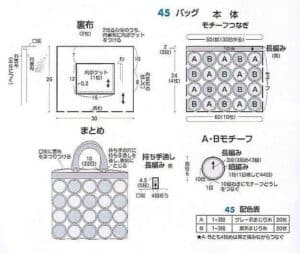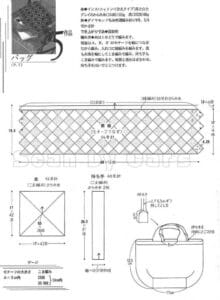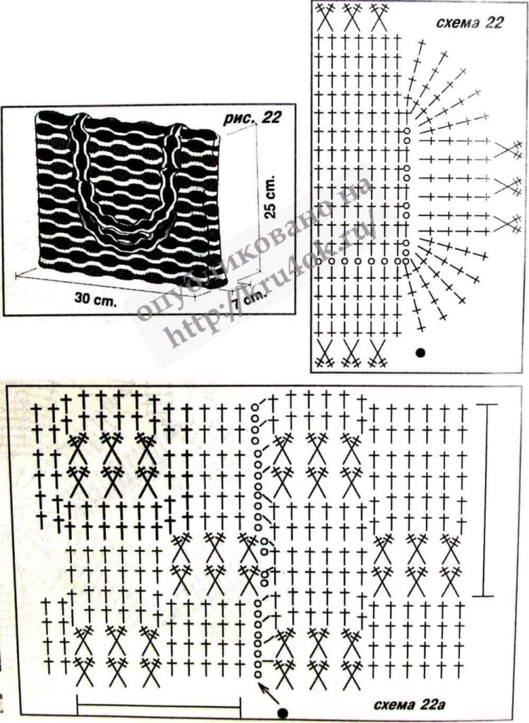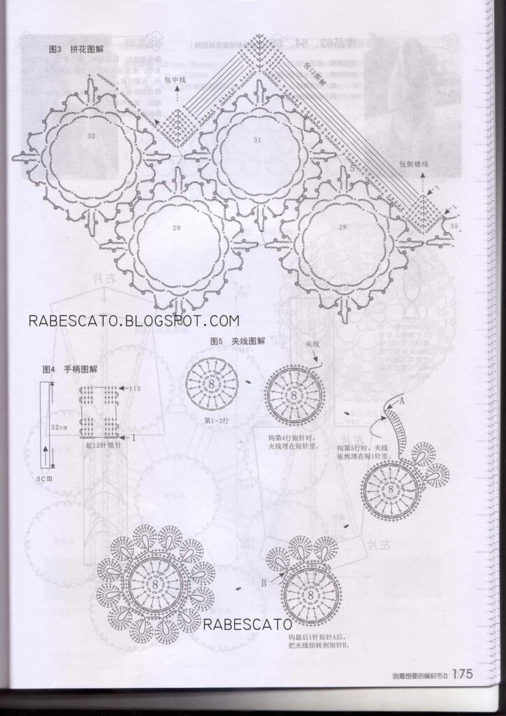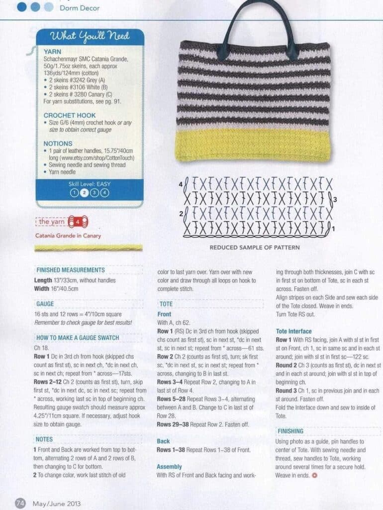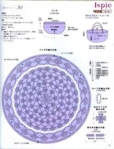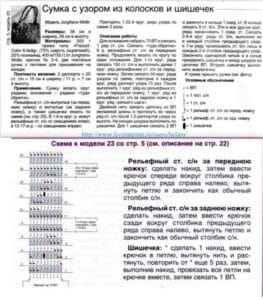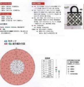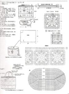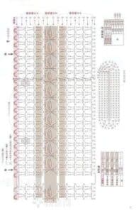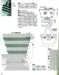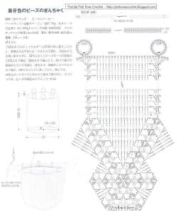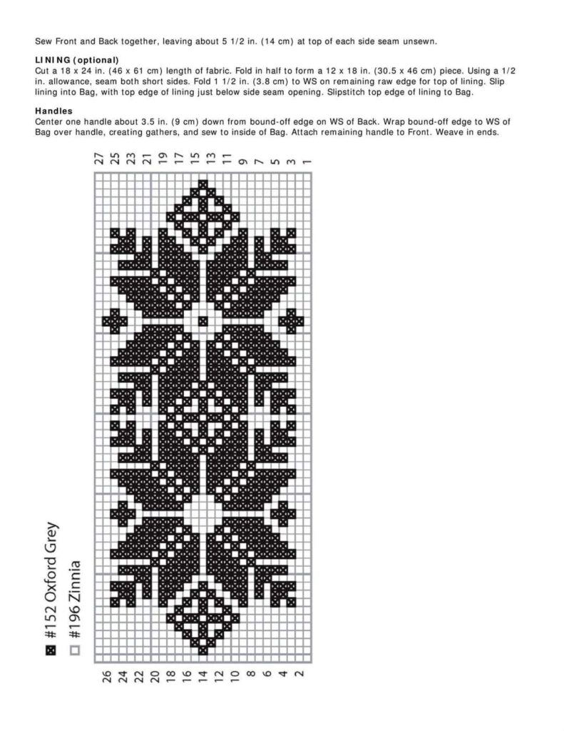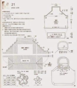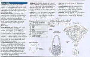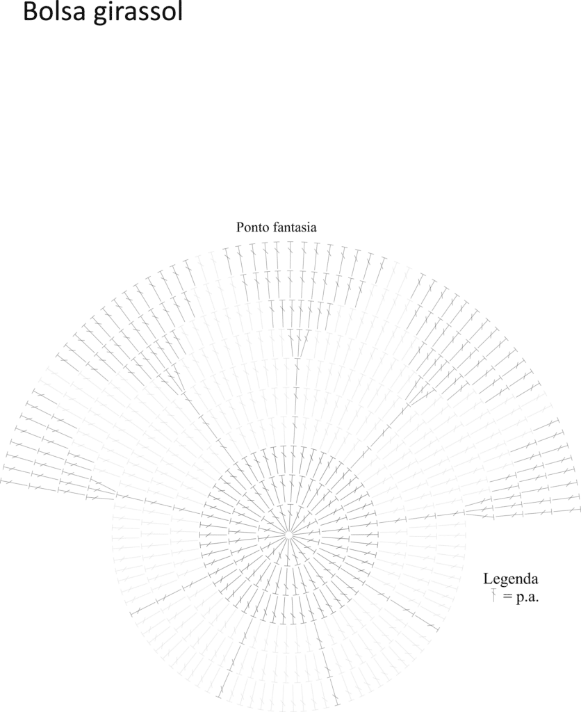 Bolsa – Com o fio marrom faça uma corr. de 6 p. feche em círculo e trabalhe em p. fantasia seguindo o gráfico, siga as cores indicadas no gráfico. Terminado o gráfico rem.. Faça 2 partes iguais. Lateral – Com o fio verde uma corr. de 154 p. feche em círculo e trabalhe em p. a.. Na 3ª carr. em p. a. para a abertura da bolsa trabalhe do seguinte modo: 5 p. a., faça uma corr. de 32 p., pule 32 p. da carr. anterior e continue a carr. em p. a. Na 4ª carr. faça 32 p. a. na corr. da abertura. Faça mais uma carr. (=5 carr.) e rem.. Alça – Com o fio verde faça uma corr. de 150 p. mais 3 corr. para virar e trabalhe 2 carr. em p. a. e rem.. Faça no outro lado da corr. mais 2 carr. em p. a. e rem.. Com o fio cru faça a toda volta da alça uma carr. em p. b. e rem.. Acabamento – Costure o zíper na abertura da lateral. Com o fio branco faça uma corr. juntando uma parte da bolsa com uma borda da lateral. Prenda do mesmo modo a lateral na outra parte da bolsa. Costure a alça na bolsa deixando o zíper entre os dois lados da bolsa (veja foto).