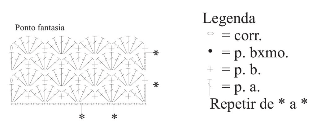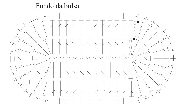 Comece pelo fundo. Faça uma corr. de 13 p. mais 3 corr. para virar e trabalhe em círculo, seguindo o gráfico do fundo. Terminado o gráfico trabalhe em p. fantasia seguindo o gráfico, repita de * a * no sentido dos p. (12 v.). Faça a 1ª carr. do p. fantasia pegando somente na alça de trás do p. da carr. anterior. Feche todas as carr. com 1 p. bxmo. e inicie com corr.. A 9 cm do início do p. fantasia rem..