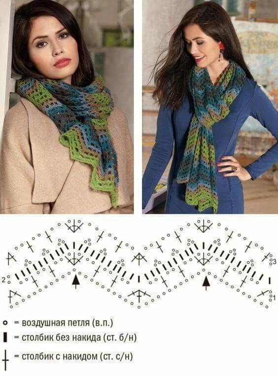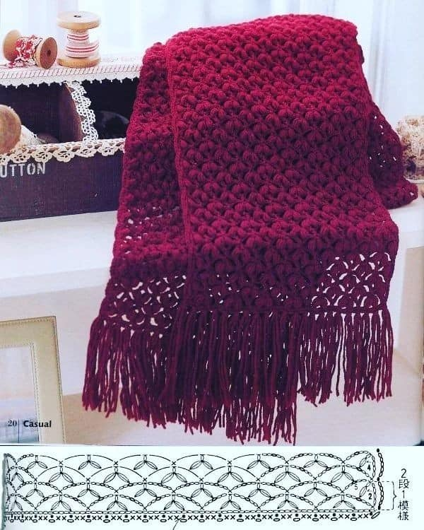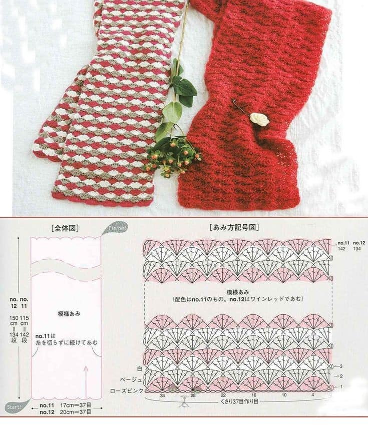 - Cachecol longo clássico: modelo tradicional, ideal para quem gosta de enrolar várias vezes no pescoço. O ponto alto duplo dá fluidez à peça.