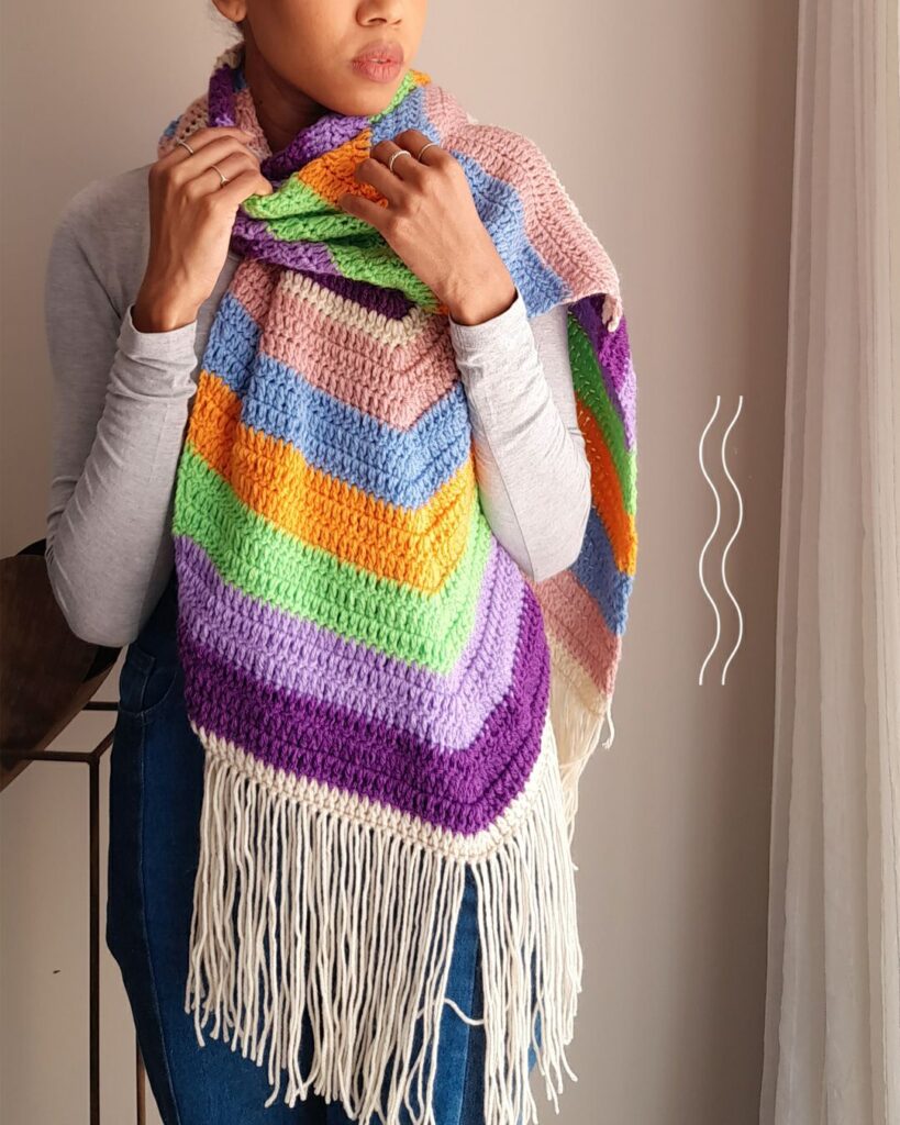 - Cachecol triangular: estilo boho e despojado, fica lindo com franjas ou aplicações de crochê.
