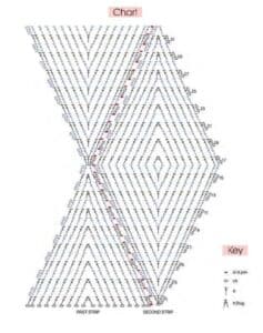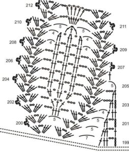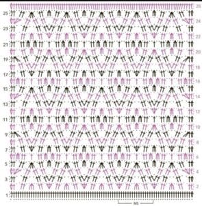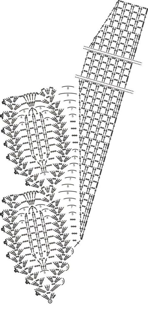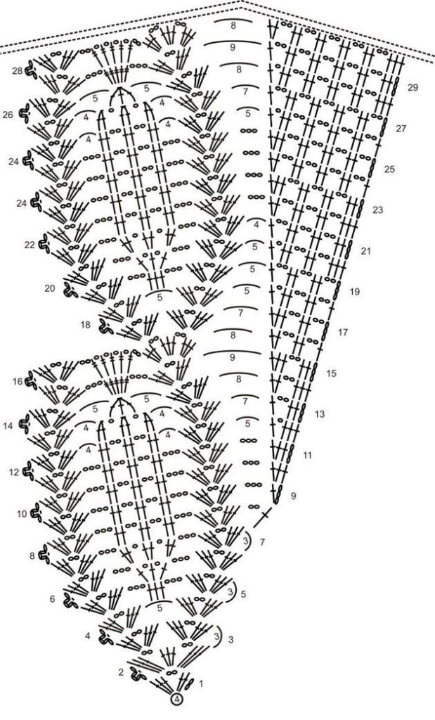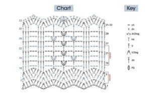 2ª carr.: Faça 1 corr e vire o trabalho, no 1º ponto faça 1 PB, 2 corr, 4 PA. Pule 3 pontos