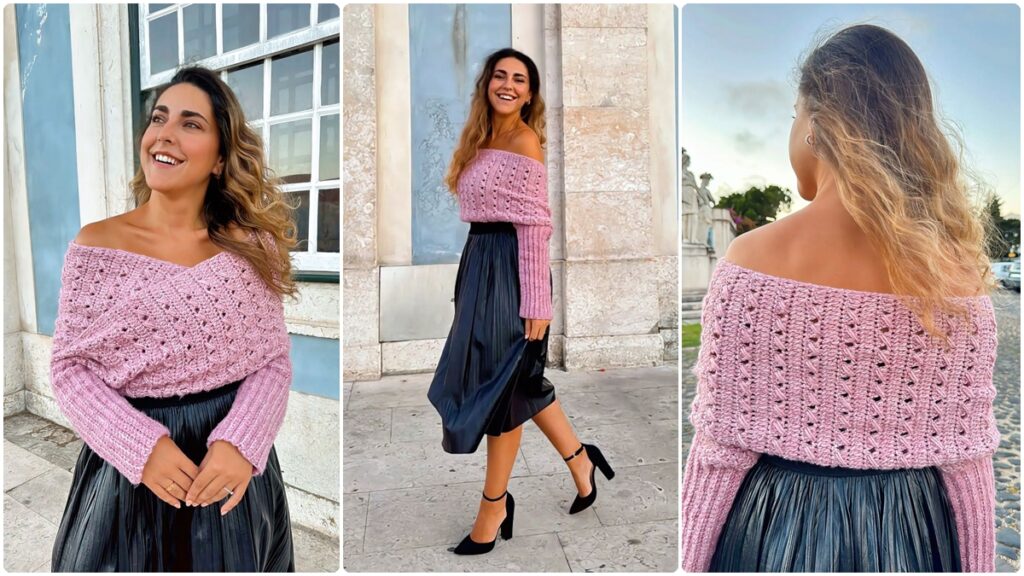 As medidas do cachecol com mangas são fundamentais para o resultado final. Recomenda-se começar pela largura — ou seja, a altura do retângulo — que deve acompanhar do ombro até onde se deseja cobrir, seja apenas a cintura ou ultrapassando o quadril. O comprimento é ajustado durante a confecção, permitindo que a peça seja modelada diretamente no corpo para garantir encaixe perfeito. As mangas podem ser adaptadas à vontade, subindo correntinhas de acordo com o gosto: curtas, até acima do cotovelo, ou longas, até o punho.