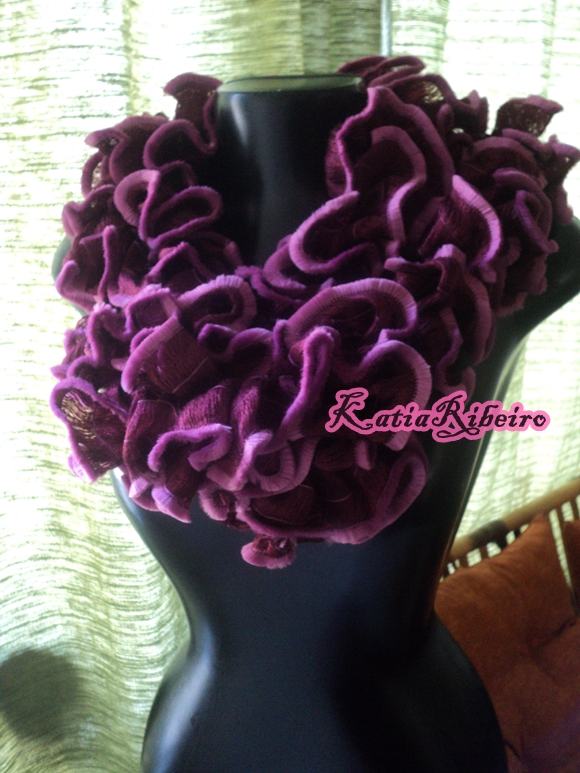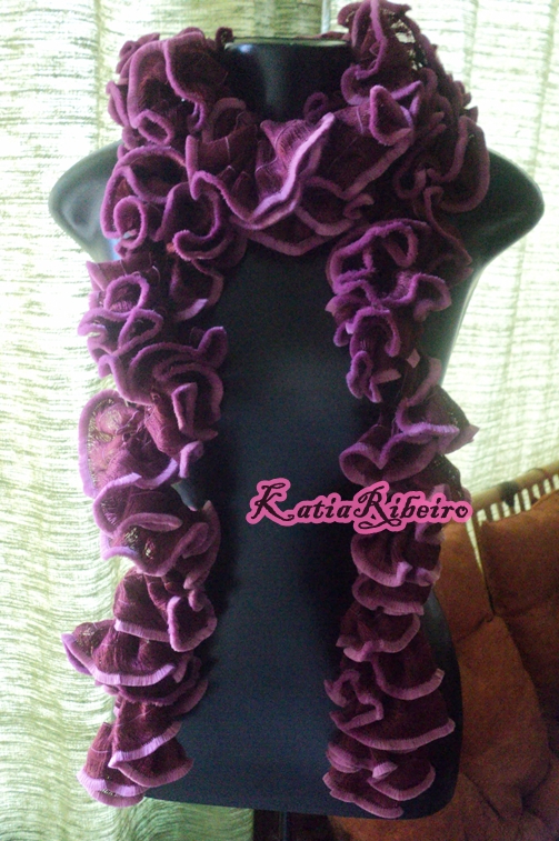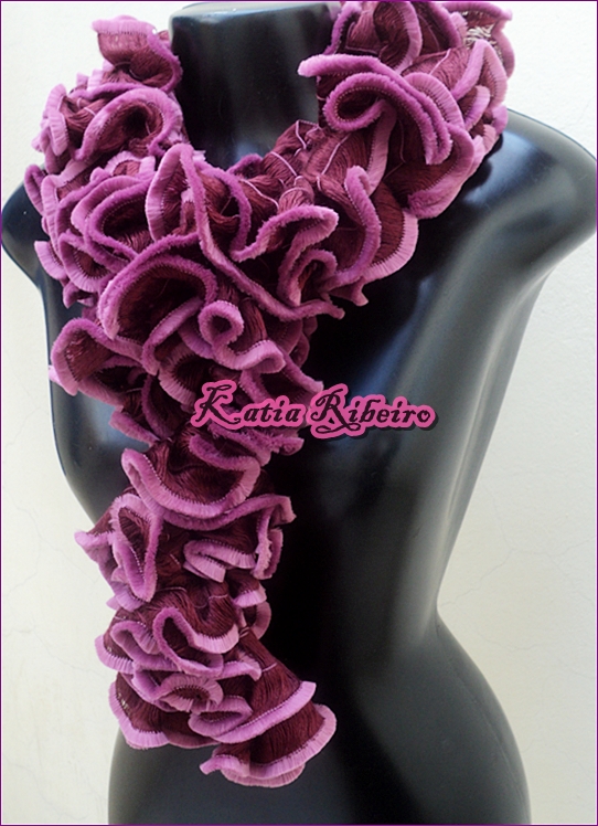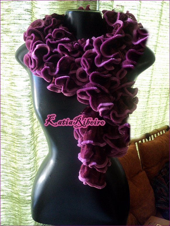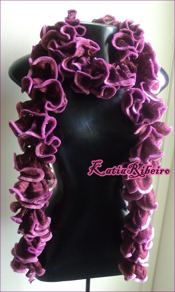 Hoje vou mostrar o fio Supremo Mirela, ele é macio e tem linda combinação de cores, fiz ele todo em crochê (fui fechando de oito em oito intervalos para ficar os babadinhos), nas pontas ele tem um veludo desfiado maravilhoso, as cores também são bárbaras.