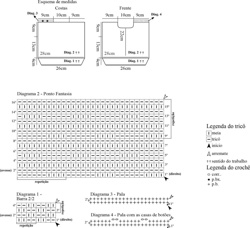 Abreviaturas: p.: ponto, pts.: pontos, rep.: repetição, m.: meia, j.: juntos, t.: tricô, tric.: tricote, carr.: carreira, ag.: agulha, v.: vezes, trab.: trabalho, diag.: diagrama, dim.: diminuir ou diminuindo. Pontos utilizados: ponto meia: siga o diag. 1, barra 1/1: siga o diag. 2. Amostra – Um quadrado de 10cm no p. meia na ag. de 3,0mm = 20 pts. x 28 carr.. Execução: Transfira os moldes para o papel vegetal para usar como referência na execução da peça. Observe as setas no esquema de medidas com a indicação do sentido do trabalho. Costas: Inicie a peça pela barra dupla. Para a preparação da barra dupla utilize a ag. para tricô reta de 3,0mm e a ag. circular de 3,0mm. Use o fio Mais Bebê na cor rosa e faça a montagem provisória dos 70 pts. nas ag. de 3,0mm. Na ag. circular parte inferior ficarão os 70 pts., à espera e na ag. reta parte superior ficarão os outros 70 pts. para subir o trab.. Tric. os 70 pts. da ag. reta em p. meia por 10 carr.. A seguir deixe as ag. paralelas (total de 140 pts. sendo 70 de cada ag.) e tric. os pts. simultaneamente 2 pts. j. em m. por (70 v.). Observe que neste momento sua bainha se torna dupla. Sobre os 70 pts. restantes na ag. reta de 3,0mm tric. a peça em p. meia. Tric. mais 2 carr. com o fio rosa e a seguir mude para o fio Mais Bebê na cor cinza. Para formar as listra tric. 10 carr. com o fio cinza e 6 carr. com o fio rosa. À 37cm de comprimento desde o início dê início as cavas, dim. de cada lado da peça a cada 2 carr. 3 pts. (2 v.) e 2 pts. (2 v.), totalizando na ag. 50 pts.. À 50cm de comprimento desde o início arremate todos os pts. e reserve a peça. Frente direita: Inicie a peça pela barra dupla. Para a preparação da barra dupla utilize a ag. para tricô reta de 3,0mm e a ag. circular de 3,0mm. Use o fio Mais Bebê na cor rosa e faça a montagem provisória dos 40 pts. nas ag. de 3,0mm. Na ag. circular parte inferior ficarão os 40 pts., à espera e na ag. reta parte superior ficarão os outros 40 pts. para subir o trab.. Tric. os 40 pts. da ag. reta em p. meia por 10 carr.. A seguir deixe as ag. paralelas (total de 80 pts. sendo 40 de cada ag.) e tric. os pts. simultaneamente 2 pts. j. em m. por (40 v.). Observe que neste momento sua bainha se torna dupla. Sobre os 40 pts. restantes na ag. reta de 3,0mm tric. a peça em p. meia. Tric. mais 2 carr. com o fio rosa e a seguir mude para o fio Mais Bebê na cor cinza. Para formar as listras tric. 10 carr. com o fio cinza e 6 carr. com o fio rosa. À 33cm de comprimento desde o início dê início ao decote dim. do lado direito à cada 2 carr. 2 pts. (5 v.), simultaneamente faça as dim. da cava do lado esquerdo a dim. à cada 2 carr. 3 pts. (2 v.) e 2 pts. (2 v.). À 50cm de comprimento desde o início arremate os 20 pts. restantes. Frente esquerda: Igual a direita invertendo o lado das dim. para formar o decote e cava. Manga: Inicie a peça pelo punho em barra dupla. Para a preparação da barra dupla utilize a ag. para tricô reta de 3,0mm e a ag. circular de 3,0mm. Use o fio Mais Bebê na cor rosa e faça a montagem provisória dos 46 pts. nas ag. de 3,0mm. Na ag. circular parte inferior ficarão os 46 pts., à espera e na ag. reta parte superior ficarão os outros 46 pts. para subir o trab.. Tric. os 46 pts. da ag. reta em p. meia por 10 carr.. A seguir deixe as ag. paralelas (total de 92 pts. sendo 46 de cada ag.) e tric. os pts. simultaneamente 2 pts. j. em m. por (46 v.). Observe que neste momento sua bainha se torna dupla. Sobre os 46 pts. restantes na ag. reta de 3,0mm tric. a peça em p. meia. Tric. mais 2 carr. com o fio rosa e a seguir mude para o fio Mais Bebê na cor cinza. Para formar as listra tric. 10 carr. com o fio cinza e 6 carr. com o fio rosa. À 5cm de comprimento desde o início aum. de cada lado à cada 2 carr. 1 p. (12 v.), totalizando na ag. 70 pts.. À 39cm de comprimento desde o início forme a parte arredondada da manga dim. de cada lado da peça a cada 2 carr. 5 pts. (2 v.), 3 pts. (3 v.) e 2 pts. (3 v.). À 47cm de comprimento desde o início rem. os 20 pts. restantes da ag.. Faça a outra manga igual e reserve-as. Montagem e acabamento ombros – Use a ag. de tapeçaria e o fio Mais Bebê e feche as laterais (37cm) deixando a abertura das cavas de (13cm), feche os ombros (9cm).Feche as mangas e costure-as ao redor das cavas. Para fazer as costuras use o fio rosa ou alterne as cores dos fios (rosa e cinza) acompanhando as listras da peça. Borda (palas das frentes direita, esquerda e decote): Use o fio na cor rosa e ag. circular de 3,0mm, levante ao redor das palas e parte da frente e decote o total de 300 pts.. Sendo 138 pts. pegos em cada parte da frente e 24 sobre o decote. Tric. essa borda em p. de barra 1/1 por 10 carr.. Arremate todos os pts.. Sobre a borda da frente direita pregue os 5 botões. Artesã – Loreci da Silva (205600)