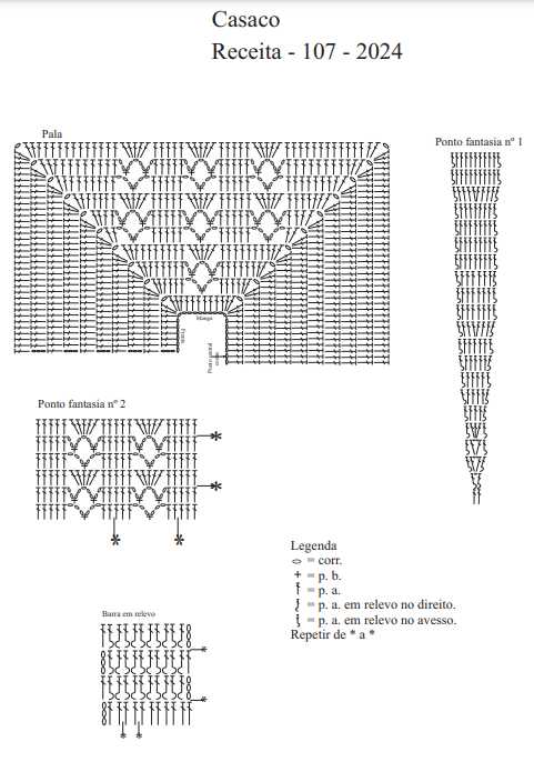 Inicie o casaco pela pala. Faça uma correntinha com 45 pontos mais 3 correntes para virar. Prosseguindo, trabalhe a pala conforme o gráfico específico. Ao finalizar o gráfico da pala, divida o trabalho e construa as partes frontais e traseiras, cuidando para deixar espaço para as mangas. A estrutura será composta da seguinte forma: