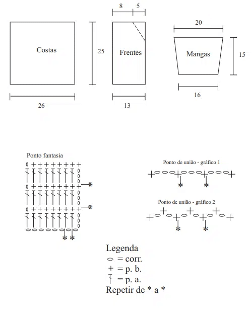 Mangas – Assim, com o fio Abecê na cor Alumínio, faça uma corr. de 29 p. mais 3 corr. para virar e trabalhe em p. fantasia seguindo o gráfico. Aum. de cada lado cada 4 carr.: 1 p. (4 v.). Então, A 15 cm do início do trabalho rem..