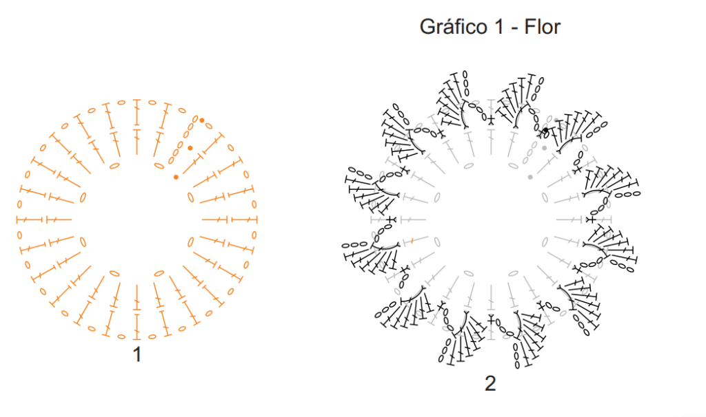 Flor: com o fio na cor raio de sol, faça 8 correntinhas, feche em círculo com 1 p. bxmo. e siga o gráfico 1 ou receita abaixo.