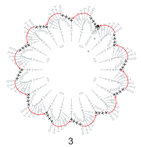 3ª carr.: com o fio na cor branca, *1 p. baixo pegando a laçada da frente do p. alto seguinte, 3 corr., 5 corr., 1 p. alto pegando a laçada da frente do p. alto seguinte, 3 corr., 6 p. altos de cima para baixo no p. alto* 12x.