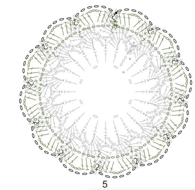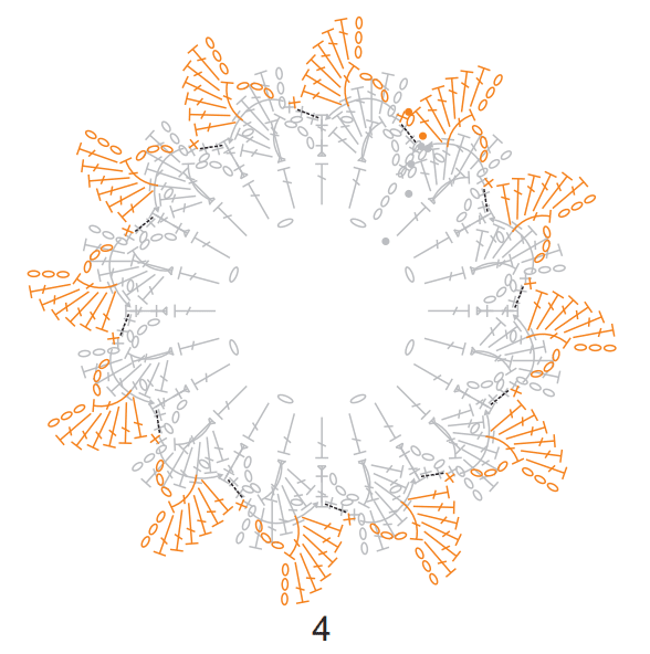 6ª carr.: com o fio na cor trilha, *1 p. baixo em relevo pegando por trás dos 2 p. baixos entre 2 pétalas da carr. anterior, 6 corr.* 12x.