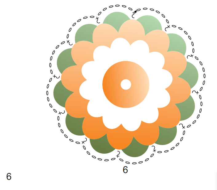 8ª carr.: com o fio na cor branca, *1 p. baixo em relevo pegando por trás dos 2 p. baixos entre 2 pétalas da carr. anterior, 6 corr.* 12x.