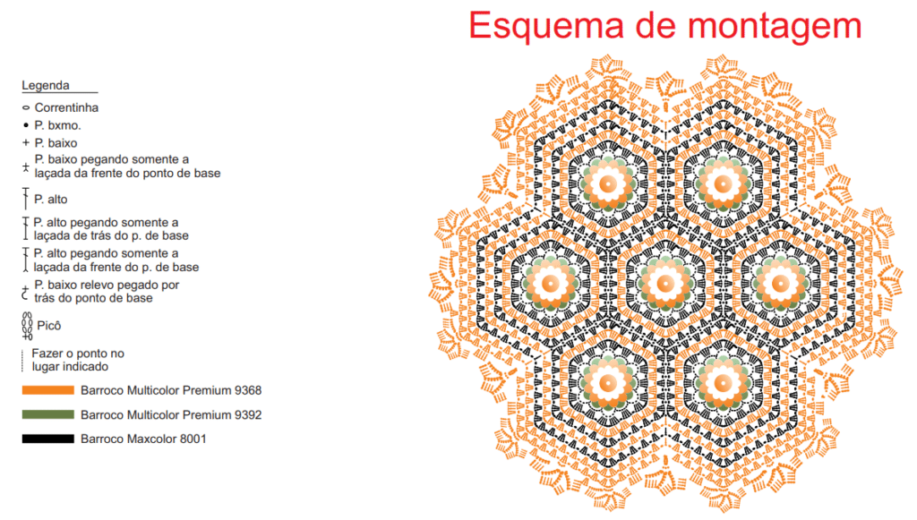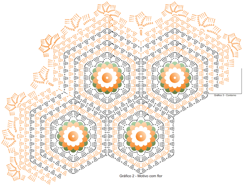 Motivo com flor: com o fio na cor branca, siga o gráfico 2 ao redor da flor. Observe as trocas de cor dos fios no gráfico. Una os motivos com p. baixo na última carr. do gráfico, como mostra o esquema de montagem.