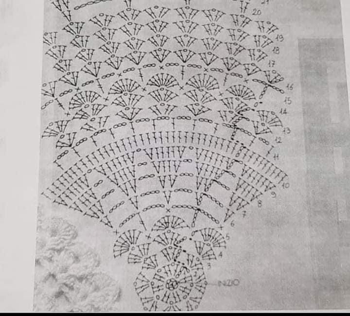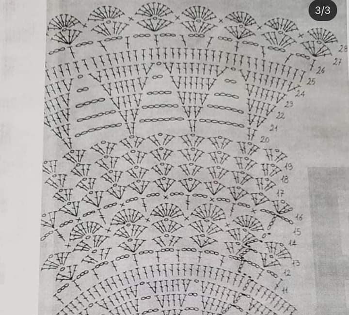 - Terceira carr.: inicie com 6 corr. *1 p.b., 5 corr.* repita de *a* mais 20x; finalize com 2 corr. 1 p.a. sobre a corr. inicial.