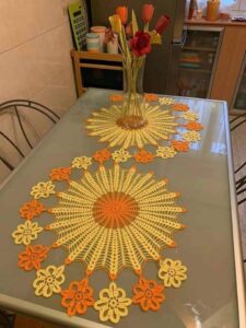 - Adicione pequenos detalhes como flores de crochê, borlas ou franjas nas extremidades do centro de mesa para um toque extra de charme.